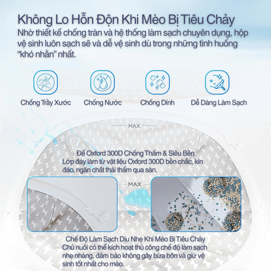 Hệ thống vệ sinh dễ dàng giúp sản phẩm bền bỉ và đảm bảo vệ sinh tuyệt đối cho mèo.