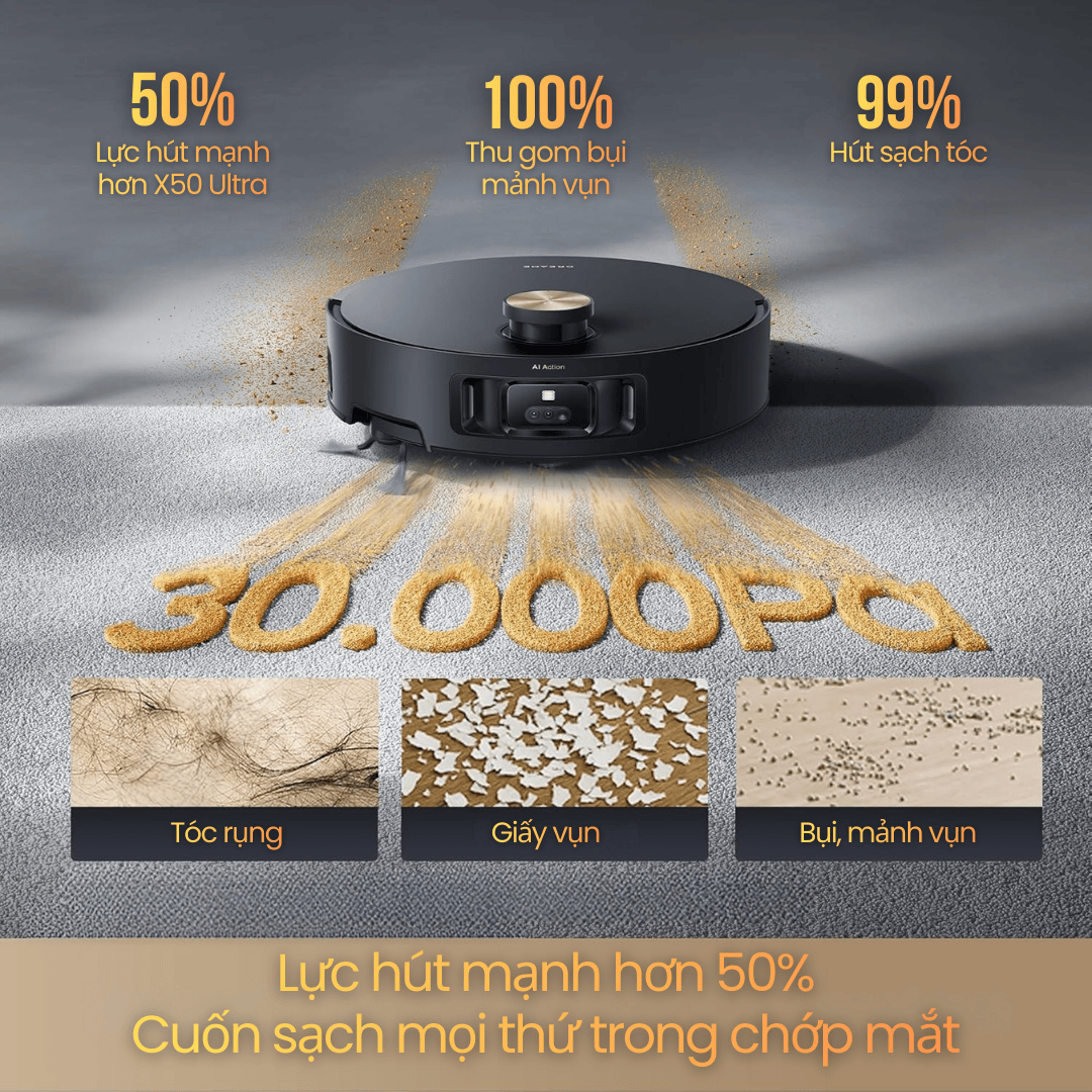 - Lực hút Vormax™ 30.000Pa - Mạnh nhất phân khúc, làm sạch 100% bụi bẩn
