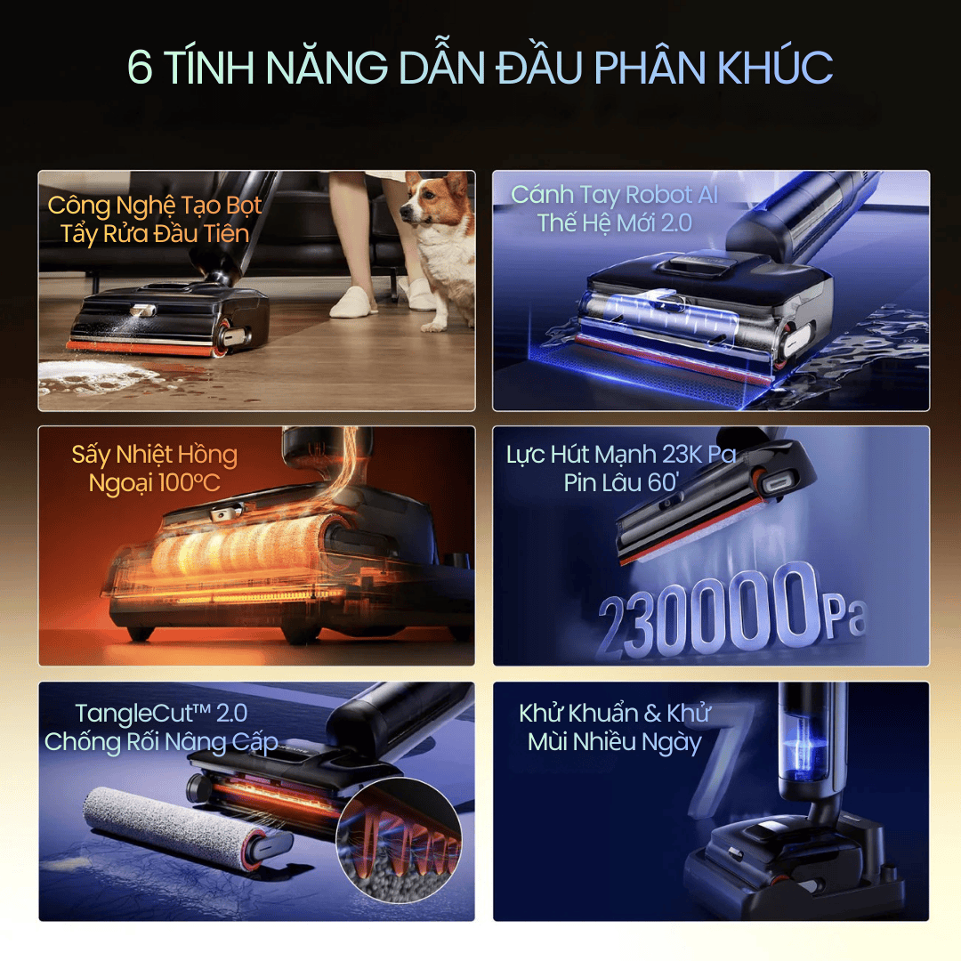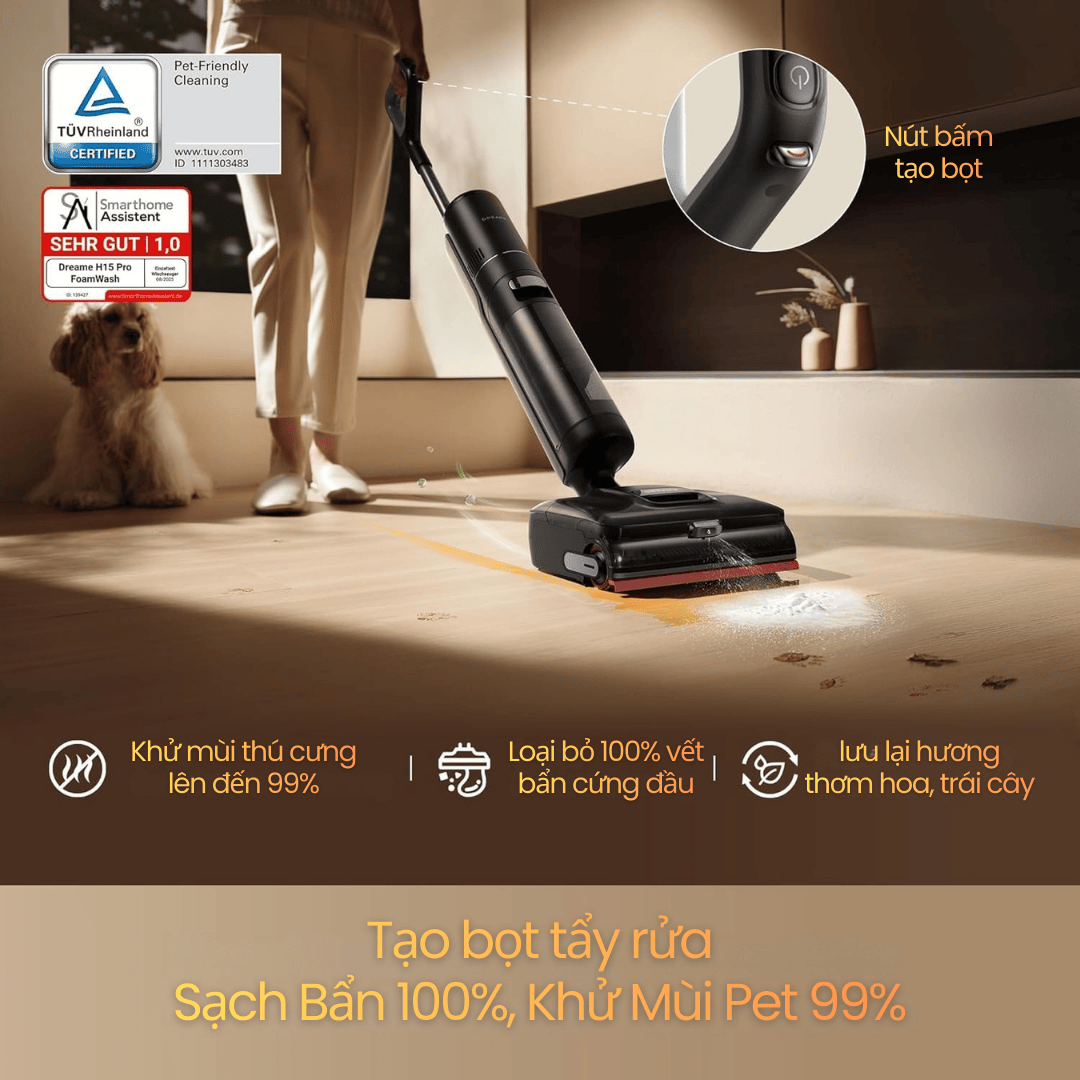 Dreame H15 Pro FoamWash ra đời để giải quyết toàn bộ những vấn đề đó. Đây là máy hút bụi lau nhà đầu tiên trên thế giới ứng dụng công nghệ FoamWash, kết hợp cùng AI Robot Arm, TangleCut 2.0, ThermoTub 100°C, và lực hút mạnh tới 23.000Pa. Tất cả tạo nên một chuẩn làm sạch hoàn toàn mới, đặc biệt tối ưu cho gia đình có 1–3 thú cưng hoặc nhà có trẻ nhỏ.