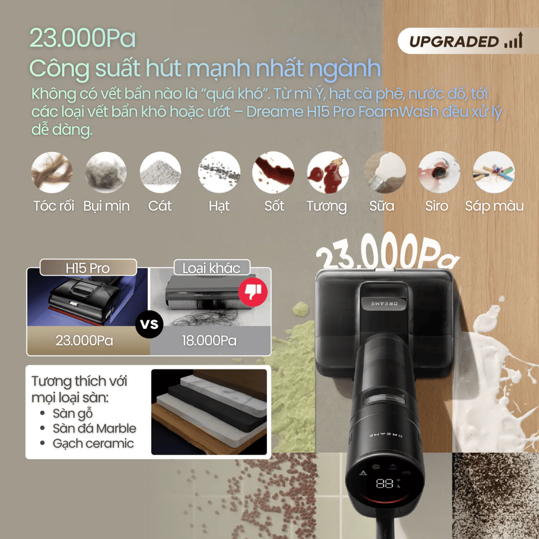 Dreame H15 Pro FoamWash sở hữu lực hút 23.000Pa, mạnh hơn 30% so với thế hệ trước.