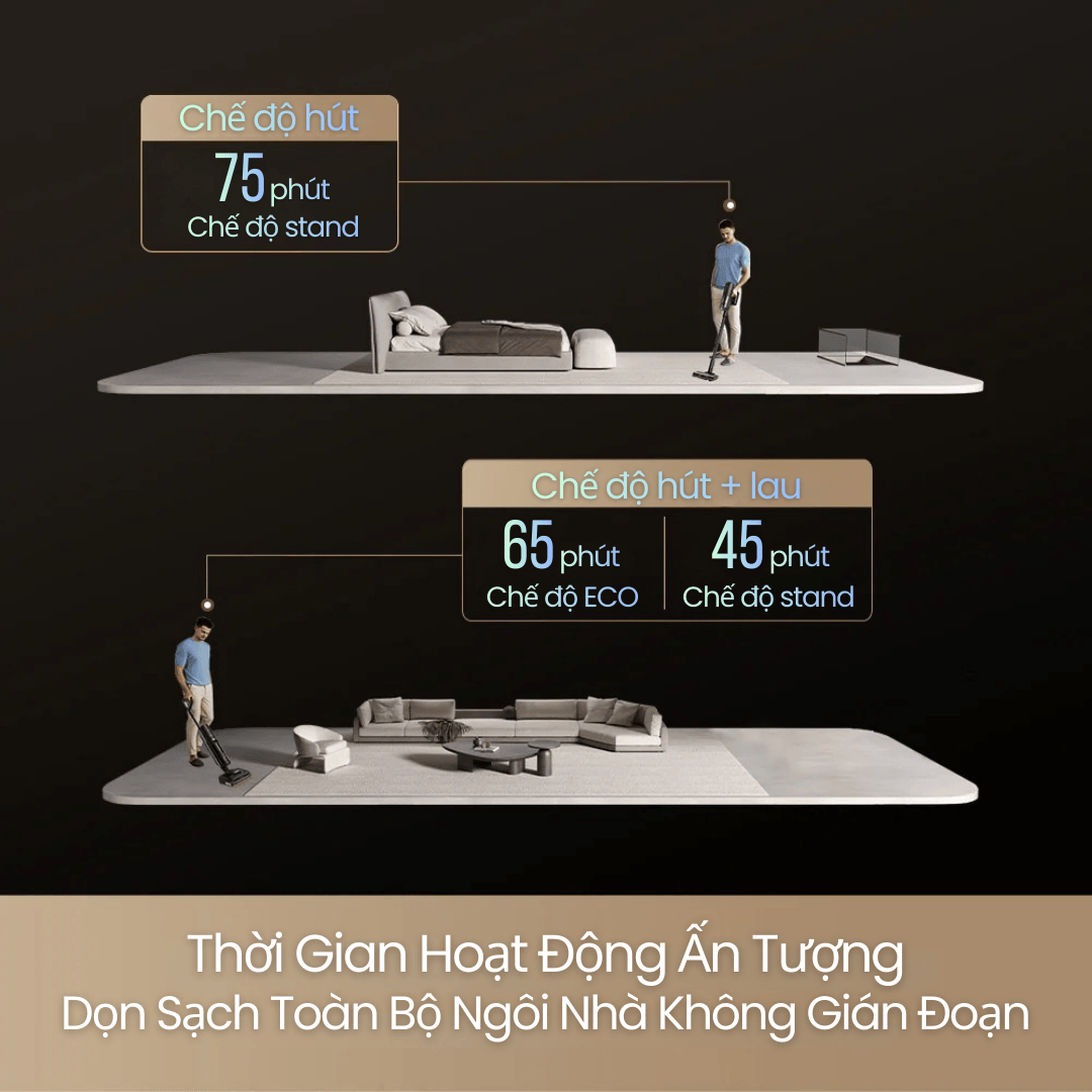 Thời gian sử dụng liên tục 60 phút, đủ để dọn toàn bộ căn hộ 150 - 200m².