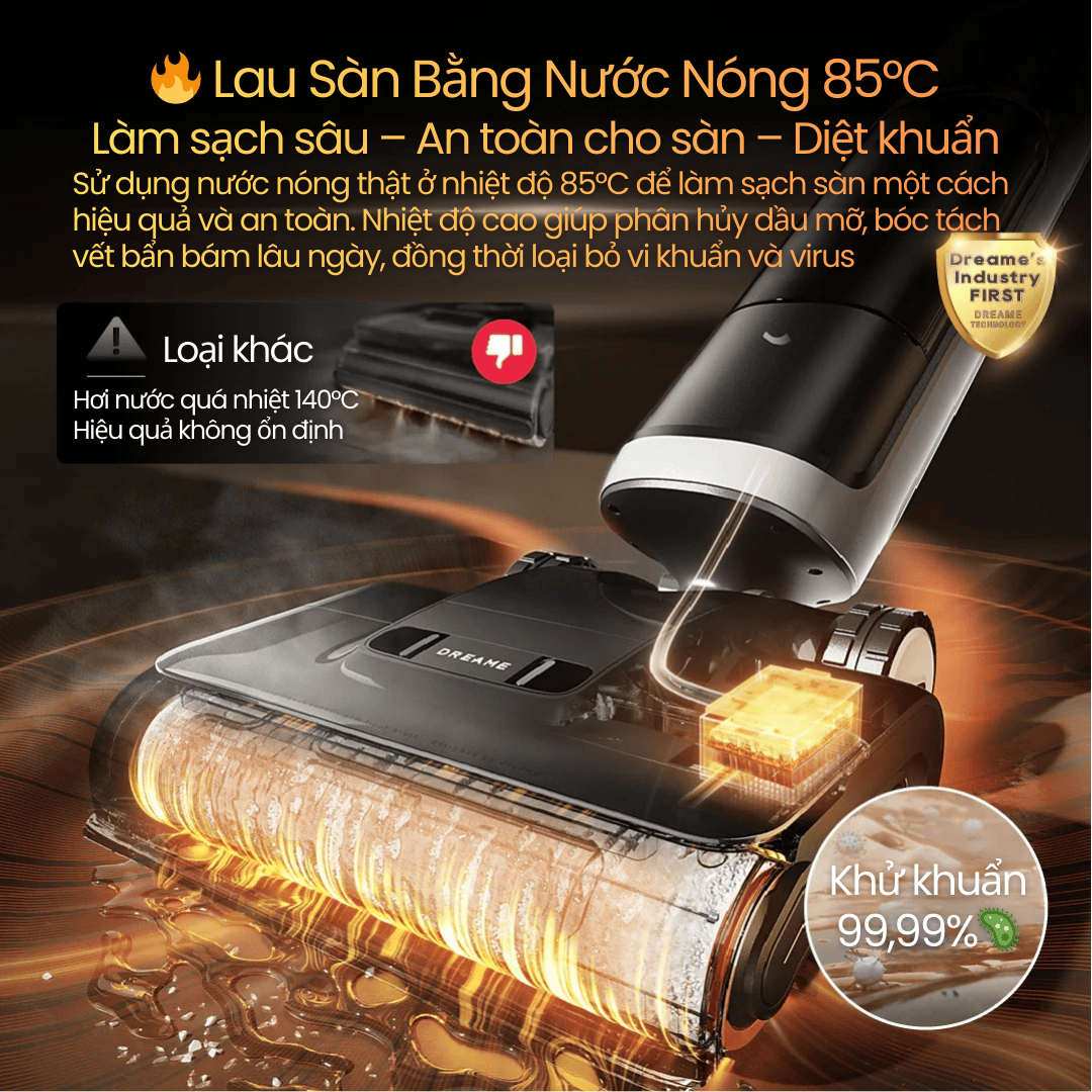 Khác với nhiều thiết bị chỉ dùng hơi nước hoặc nước ấm, Dreame H15 Pro Heat sử dụng nước nóng thật 85°C để lau sàn: