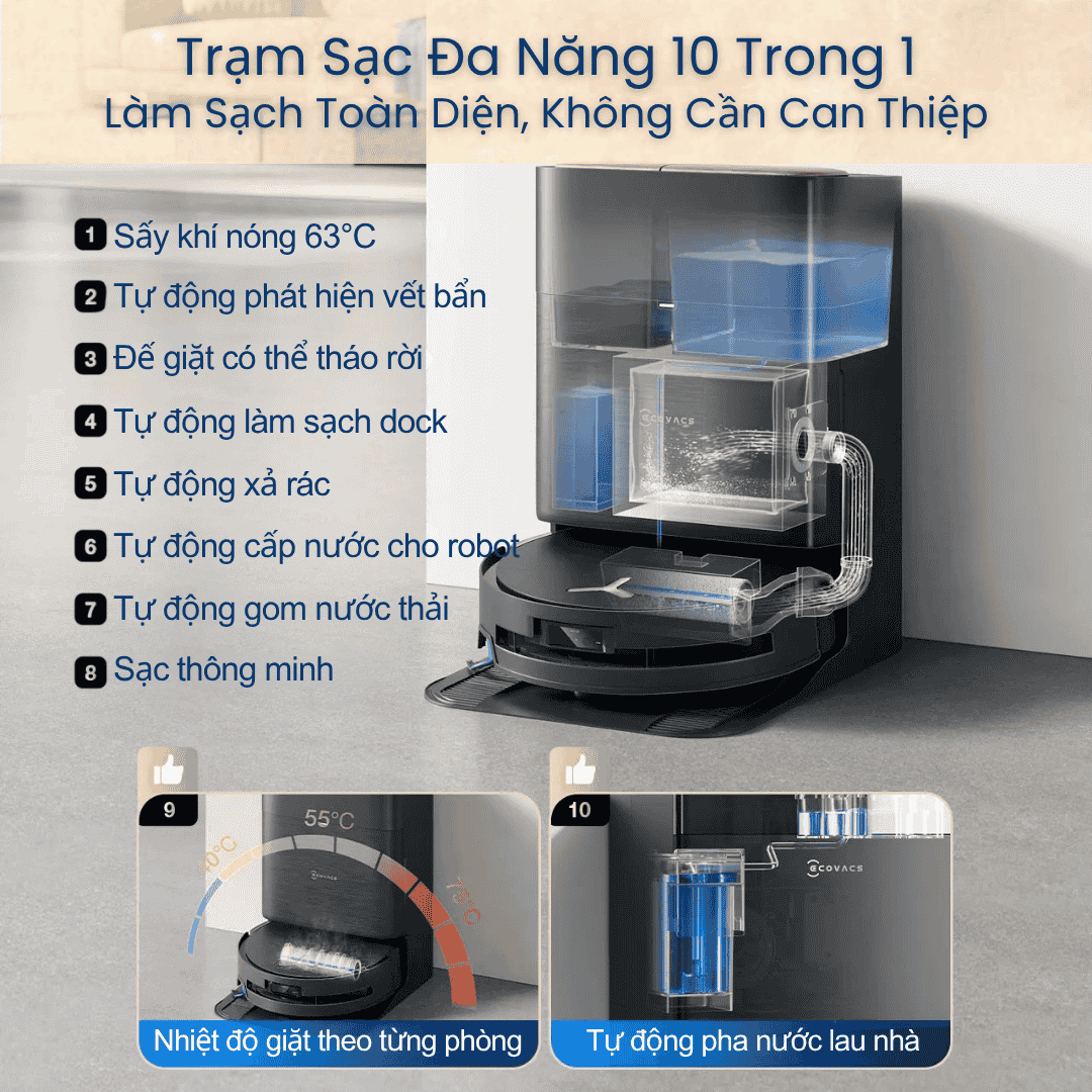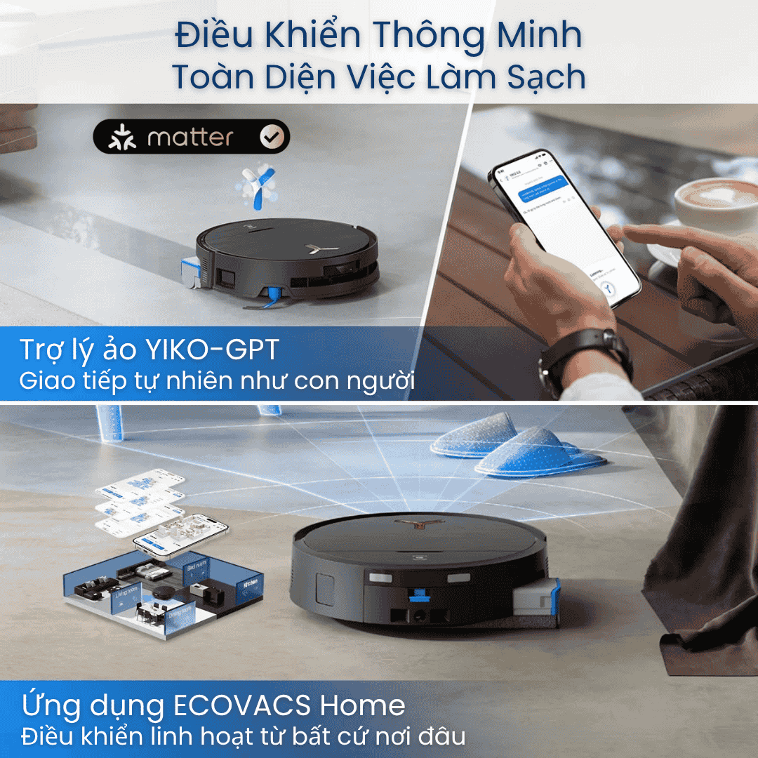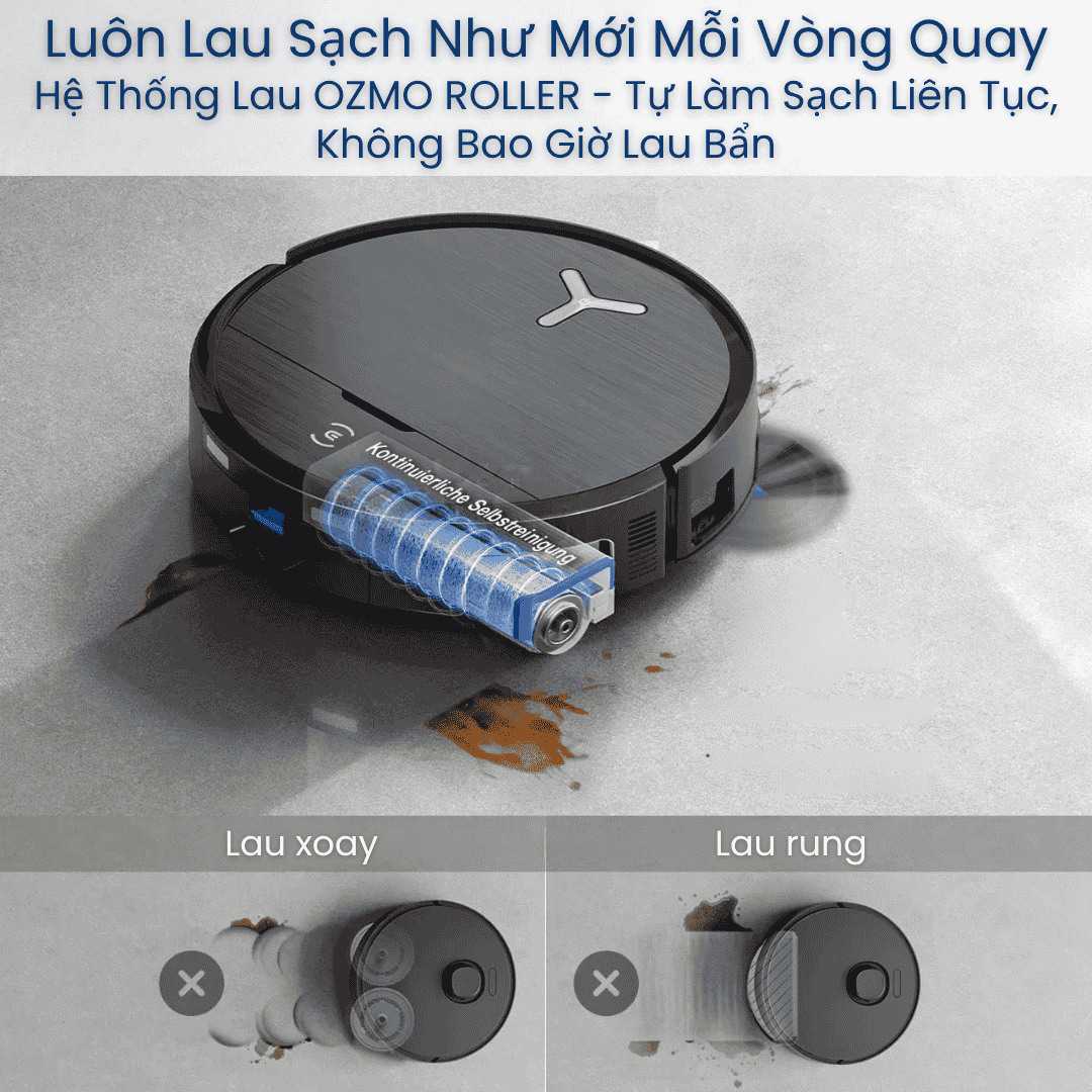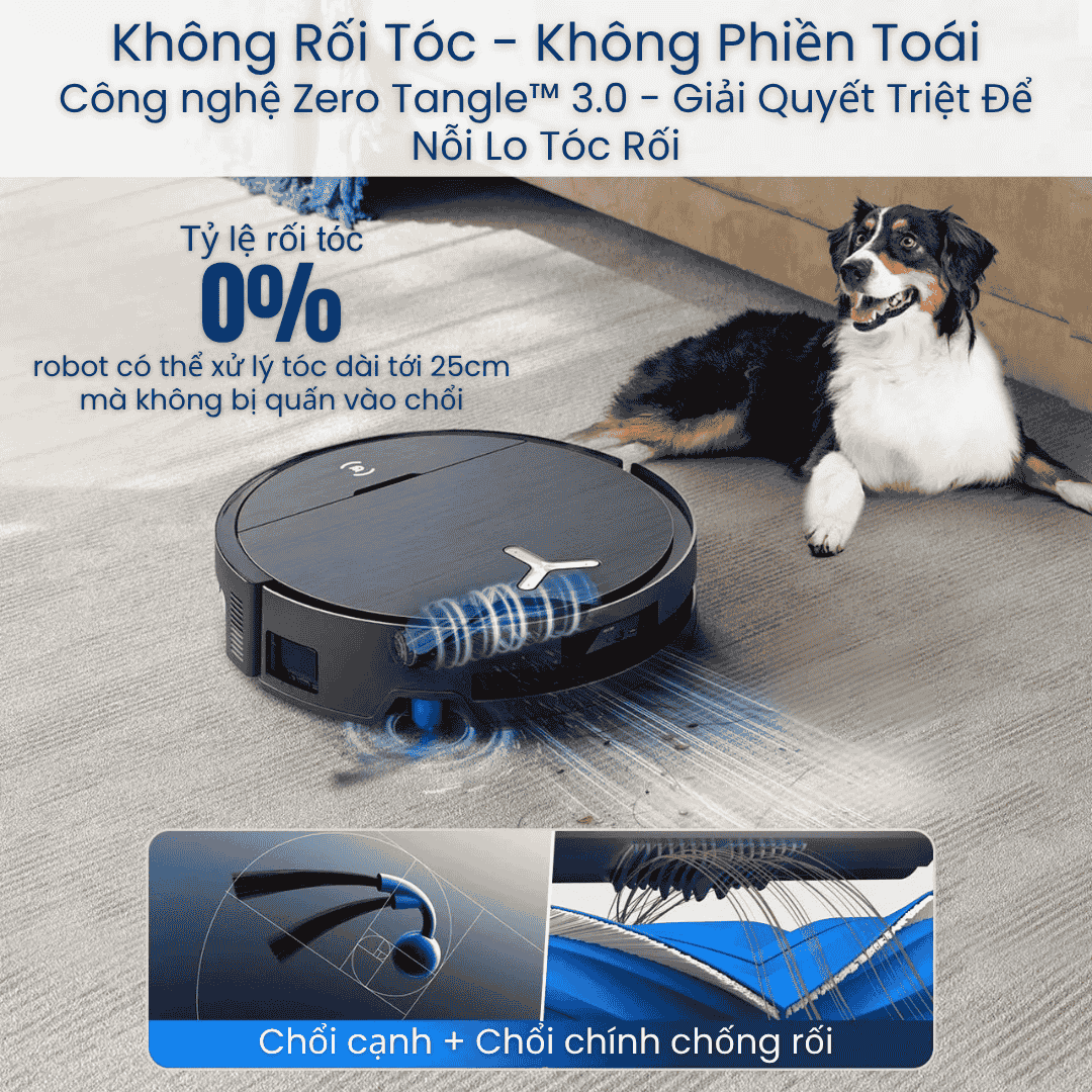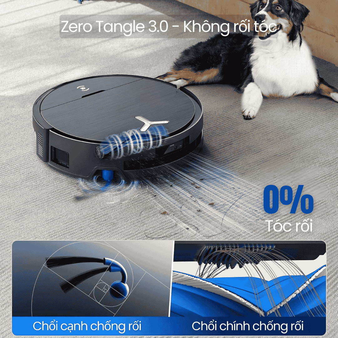 Làm sạch toàn diện: Hút mạnh – lau sâu – chống rối – chăm sóc thảm thông minh.