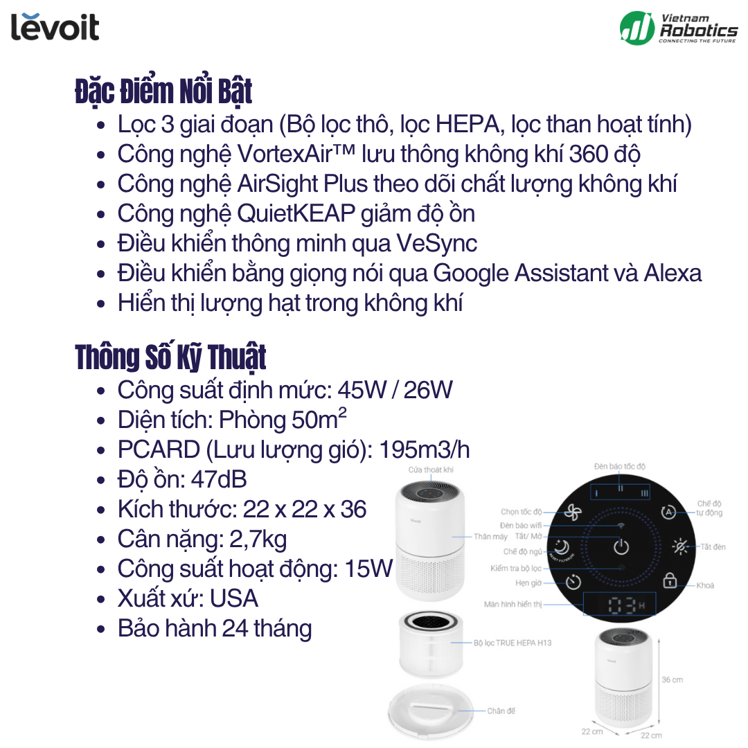 | Kết nối thông minh | VeSync App, Google Assistant, Amazon Alexa |