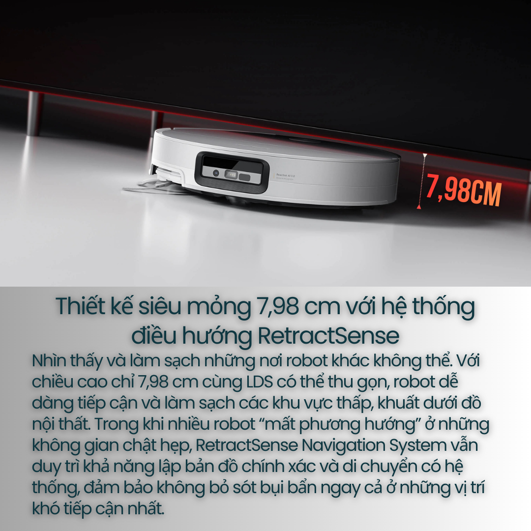 ✅ Reactive AI 3.0 + RetractSense Navigation - nhận diện hơn 200 vật thể, làm sạch gầm thấp nhờ thiết kế mỏng 7,98 cm