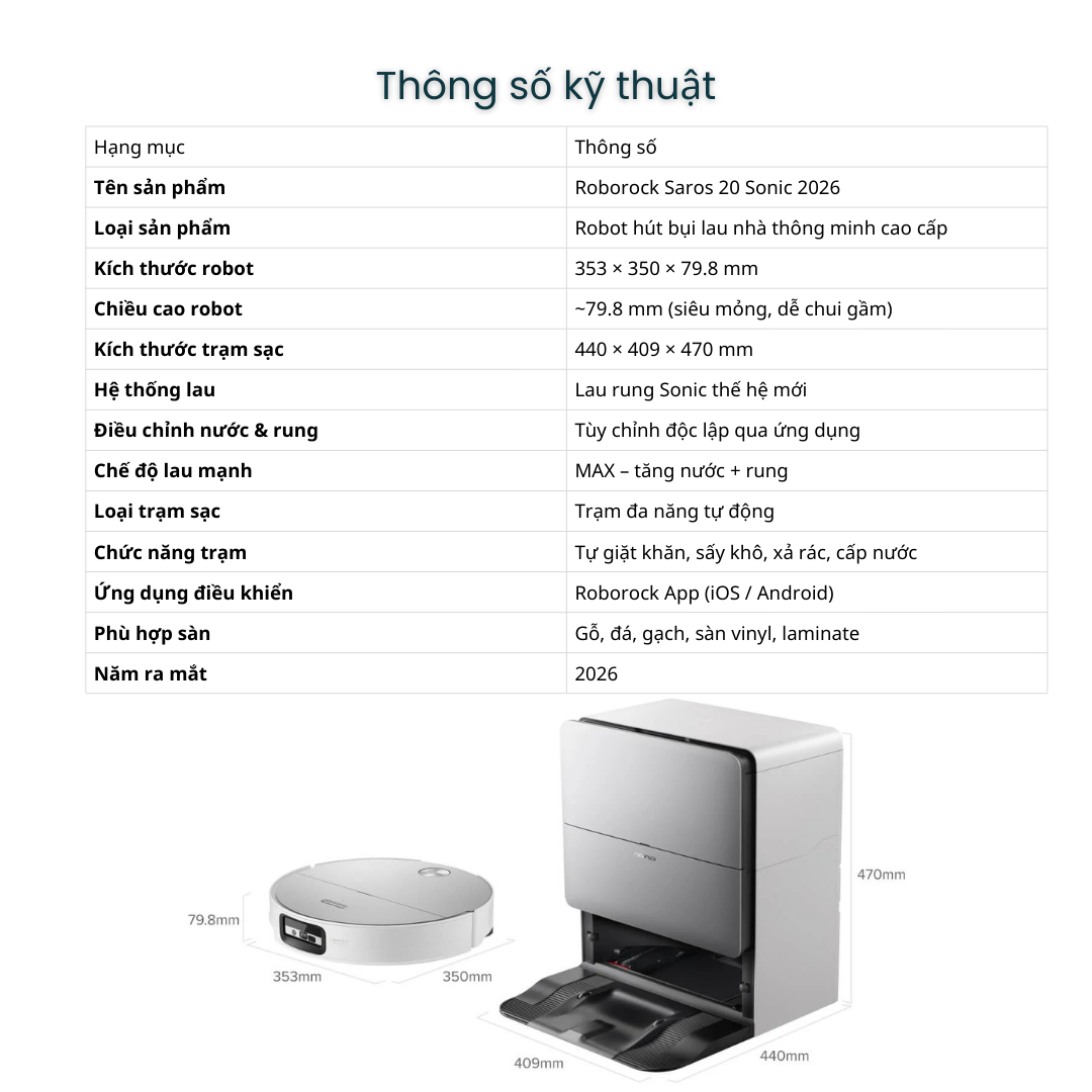 | Tên sản phẩm | Roborock Saros 20 Sonic 2026 |