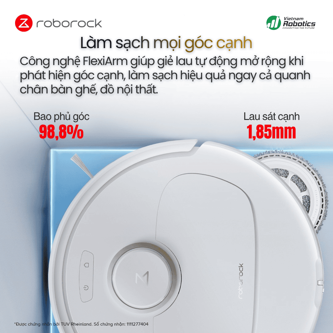 Công nghệ FlexiArm độc quyền giúp giẻ lau tự động mở rộng khi phát hiện góc cạnh, bao quát đến 98,8% khu vực ven tường và góc bàn ghế. Đây là cải tiến nổi bật giúp Roborock Qrevo 5AE đạt đến độ hoàn hảo trong từng chi tiết làm sạch.