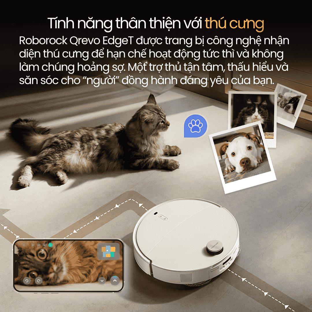 Qrevo EdgeT có thể nhận diện thú cưng và tự động giảm tốc hoặc tạm dừng hoạt động khi chúng ở gần, tránh làm chúng hoảng sợ.
