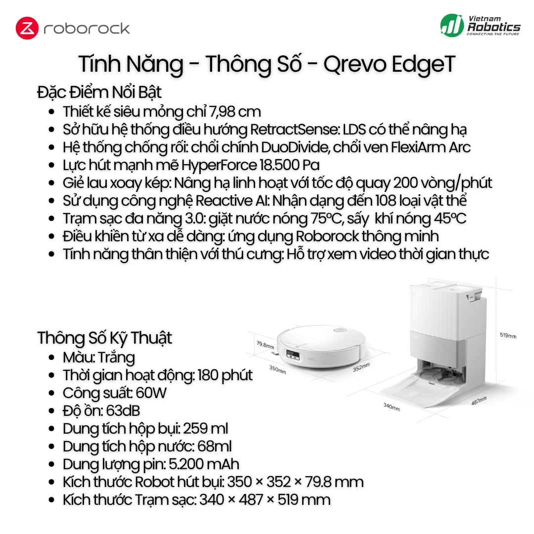 Roborock Qrevo EdgeT đánh dấu bước tiến đột phá trong công nghệ làm sạch gia đình. Với thiết kế siêu mỏng chỉ 7,98 cm, lực hút HyperForce 18.500 Pa, hệ thống giẻ lau xoay kép, và AI nhận diện 108 loại vật thể, sản phẩm này mang đến trải nghiệm vệ sinh thông minh, mạnh mẽ và toàn diện nhất từ trước đến nay. Đặc biệt, trạm sạc đa năng 3.0 tích hợp 8 tính năng tự động, giúp người dùng hoàn toàn rảnh tay trong mọi công đoạn dọn dẹp - từ hút, lau, giặt giẻ, sấy khô đến tự làm sạch dock.