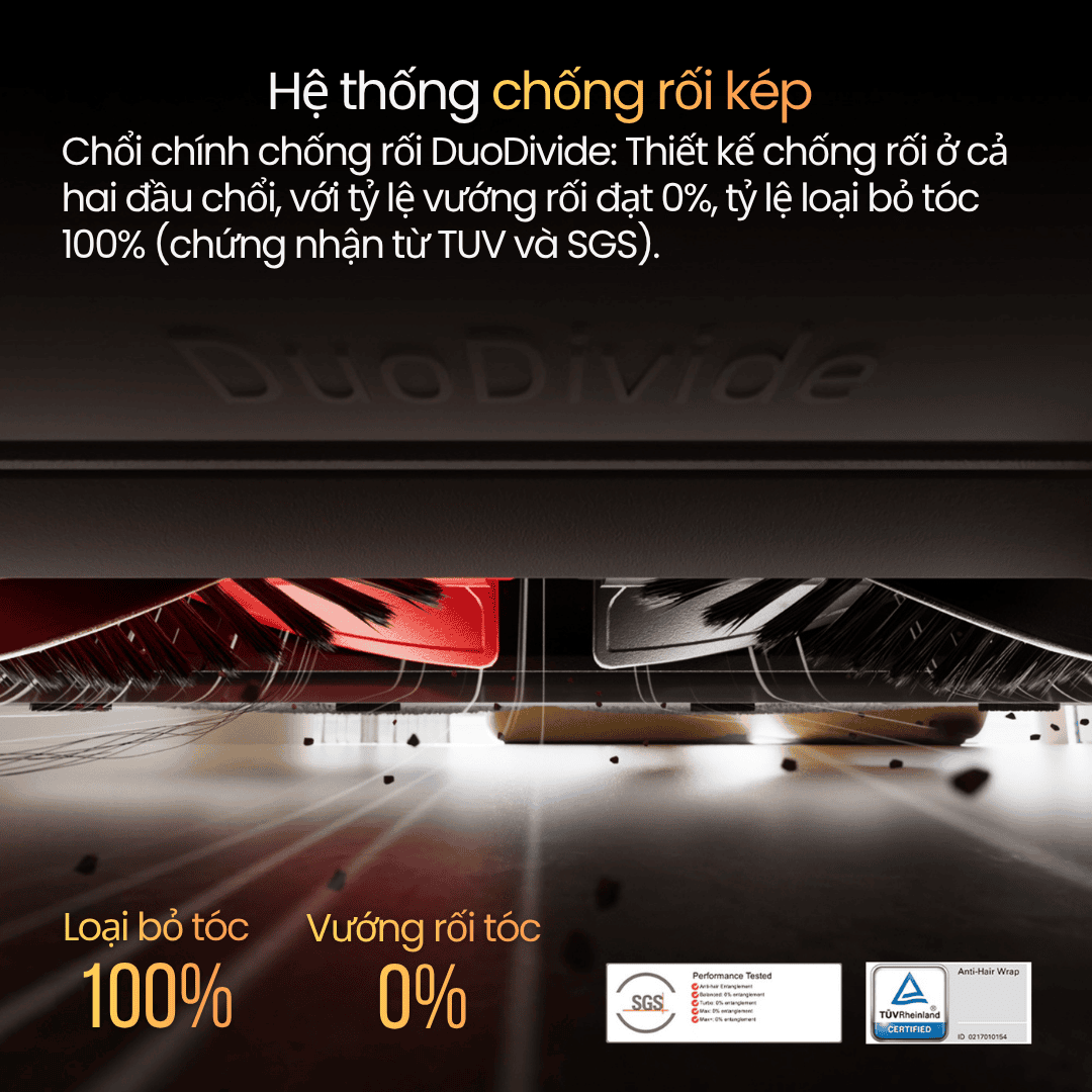 Chổi chính DuoDivide™: Thiết kế chống rối ở cả hai đầu chổi, đạt tỷ lệ vướng tóc 0%, được chứng nhận bởi TÜV và SGS.