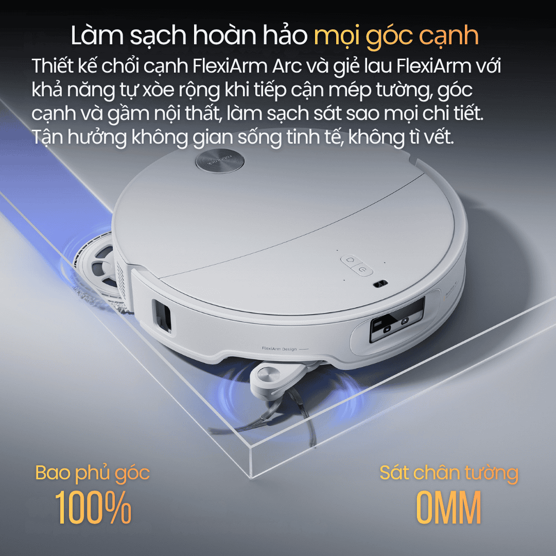 Roborock Qrevo EdgeT trang bị chổi cạnh FlexiArm Arc và giẻ lau FlexiArm thông minh có khả năng tự xòe rộng khi tiếp cận mép tường, góc cạnh và gầm nội thất, đảm bảo làm sạch triệt để 100% các vị trí khó tiếp cận. Từ chân tường đến góc bàn, mọi bụi bẩn đều được loại bỏ một cách nhẹ nhàng nhưng chính xác. Tận hưởng không gian sống tinh tế, sạch hoàn hảo và không tì vết mỗi ngày với công nghệ làm sạch độc quyền chỉ có trên Roborock Qrevo EdgeT.