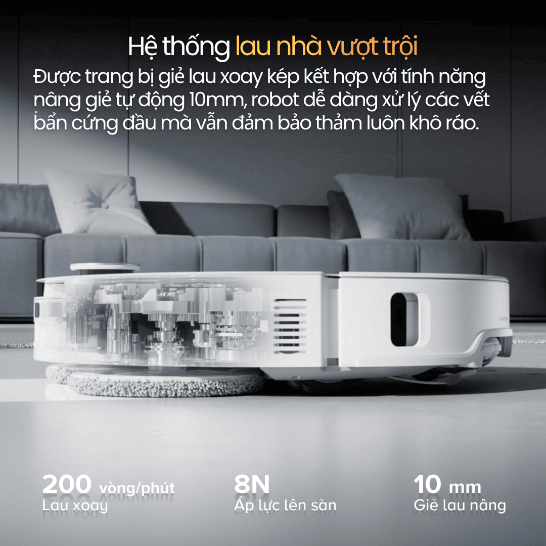 Roborock Qrevo EdgeT trang bị 2 mô-đun giẻ lau xoay tốc độ cao 200 vòng/phút, áp lực sàn lên đến 8N, có thể nâng tự động 10mm khi gặp thảm.