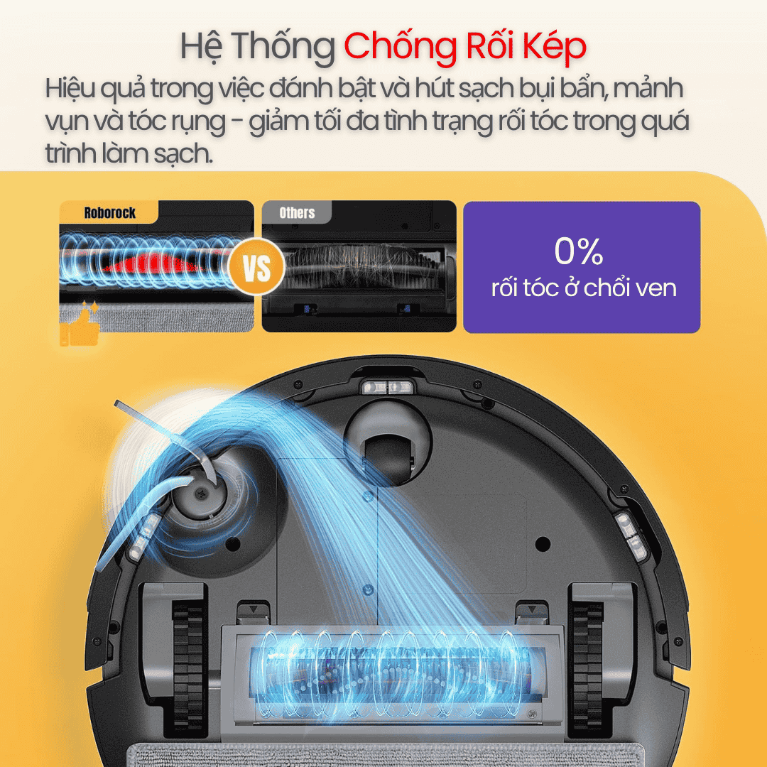 Q7 TF được trang bị chổi chính cao su tích hợp lông nylon hình chữ V, có cơ chế nổi linh hoạt tự điều chỉnh theo địa hình sàn. Kết hợp cùng chổi cạnh chống rối thông minh giúp giảm tối đa tình trạng vướng tóc - đặc biệt lý tưởng cho các gia đình có thú cưng hoặc người có tóc dài.