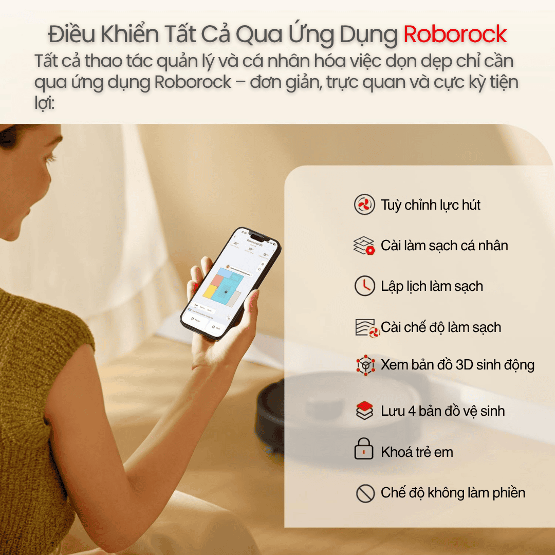 Roborock Q7 TF hỗ trợ điều khiển trực tiếp qua ứng dụng trên điện thoại thông minh (có hỗ trợ tiếng Việt).