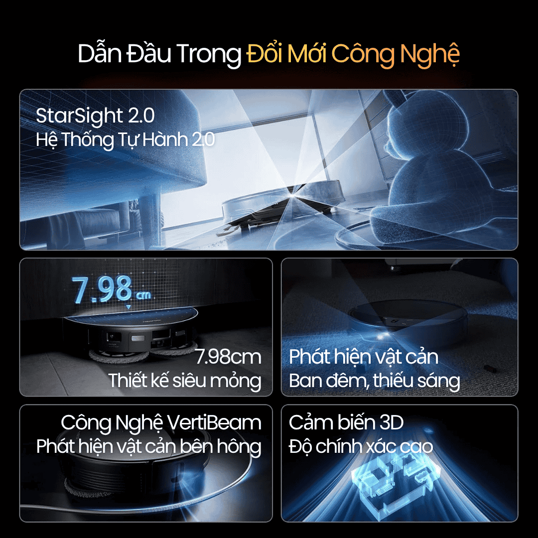 Công nghệ Reactive AI và DirTect cho phép robot nhận biết khu vực có nhiều bụi bẩn để tăng lực hút hoặc lau lại khi cần thiết - đảm bảo sàn luôn sạch hoàn hảo.
