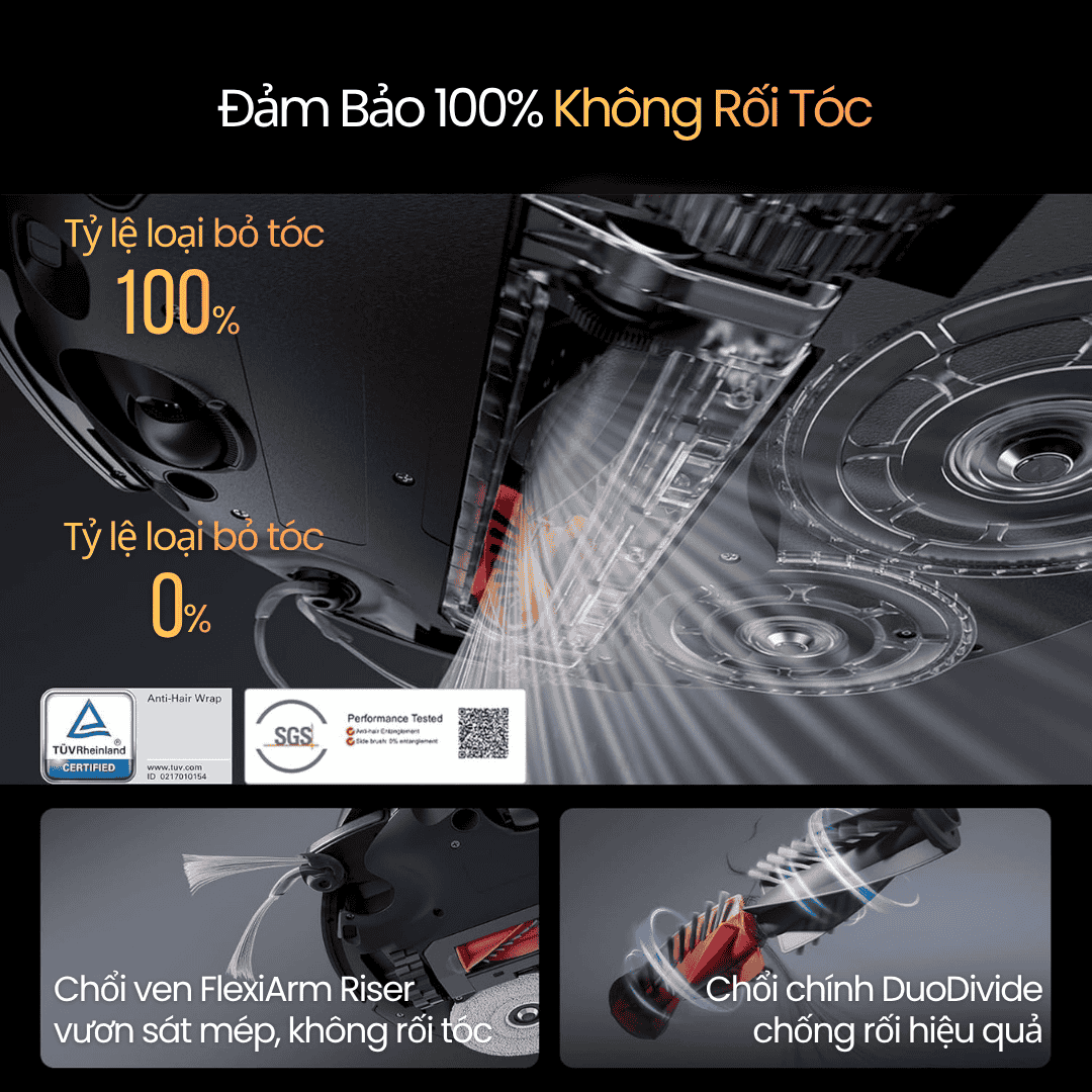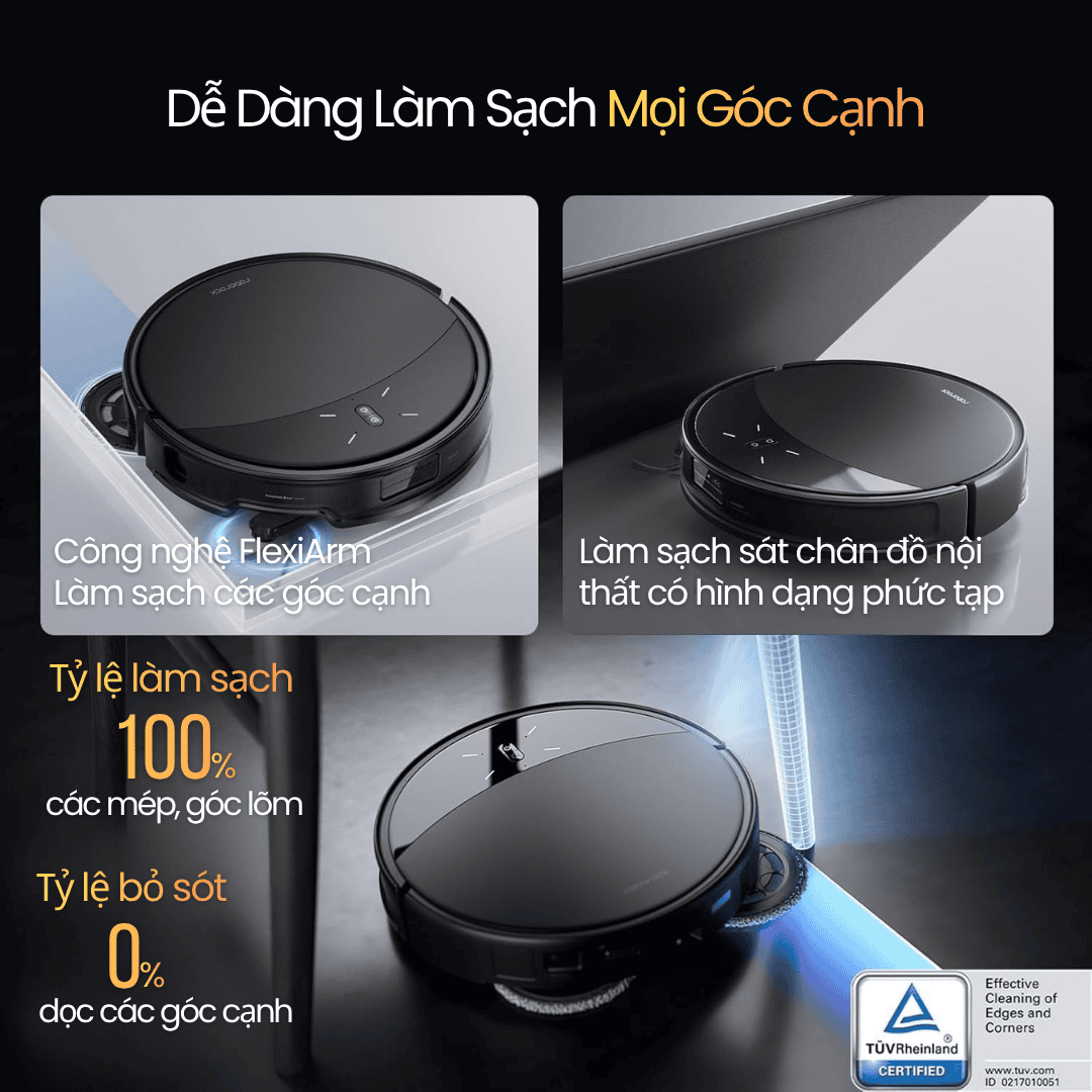 Công nghệ FlexiArm cho phép chổi cạnh tự mở rộng khi tiếp cận mép tường hoặc các góc khuất, giúp làm sạch chính xác 100% khu vực viền nhà.