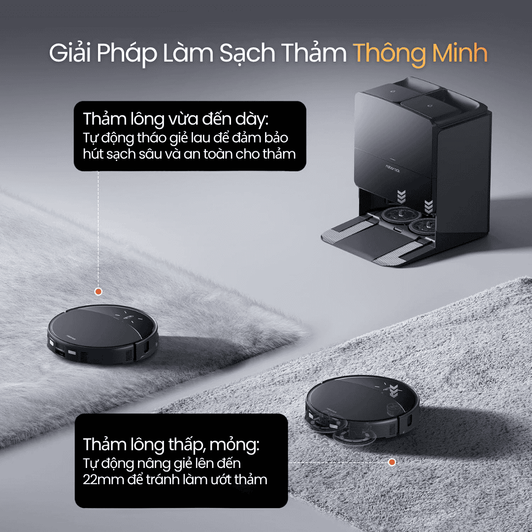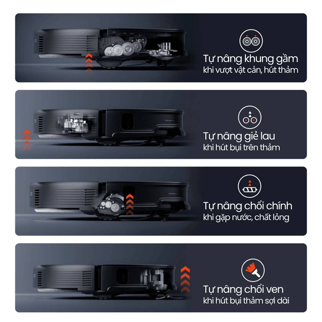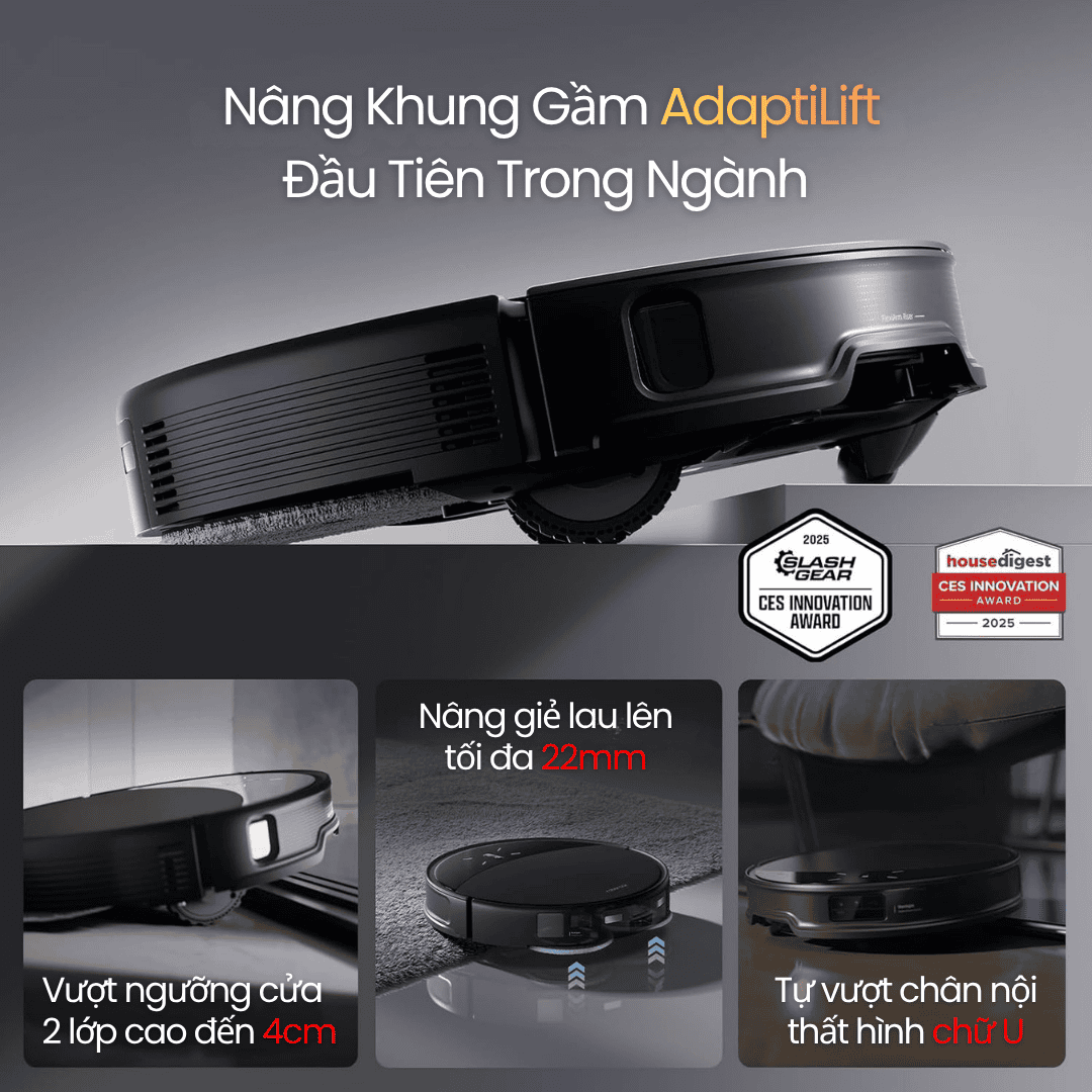 Trong khi đó, hệ thống AdaptiLift™ cho phép robot tự động nâng hạ khung gầm khi gặp vật cản, giúp di chuyển linh hoạt qua thảm hoặc bậc cao thấp mà không bị kẹt.