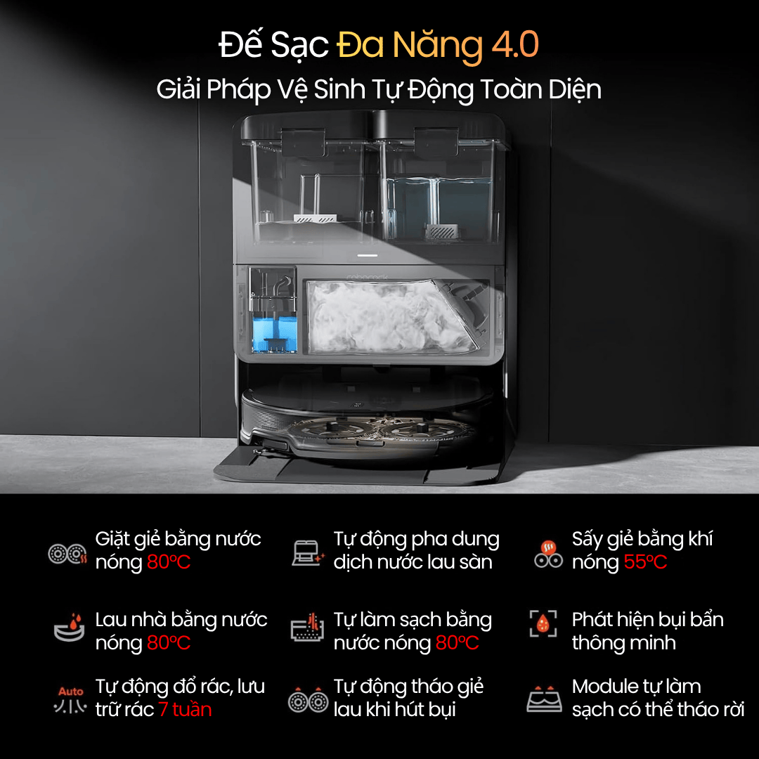 Bộ sản phẩm gồm: Robot hút bụi, trạm sạc đa năng, túi đựng bụi, mô-đun lau xoay, dây nguồn và hướng dẫn sử dụng.