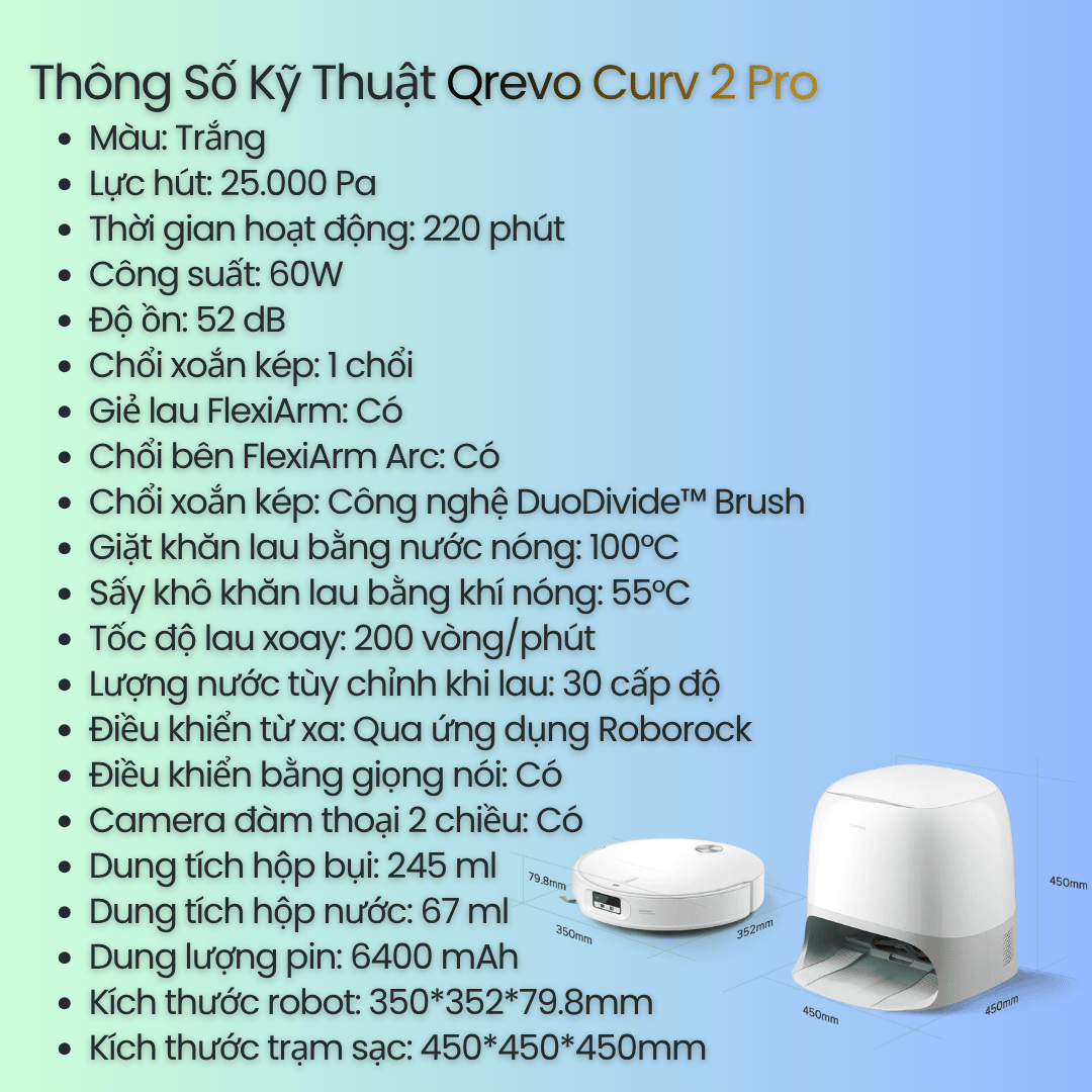 Roborock Qrevo Curv 2 Pro không chỉ là robot hút bụi lau nhà thông minh, mà còn là chuẩn mực làm sạch mới của thế giới robot gia dụng. Với ba tầng nhiệt lượng, lực hút 25.000Pa, AI nhận diện 200 vật thể và dock sạc đa năng 3.0, đây chính là lựa chọn hoàn hảo cho ngôi nhà Việt hiện đại - nơi bạn có thể tận hưởng không gian sạch khuẩn, tiện nghi mà không tốn công sức.
