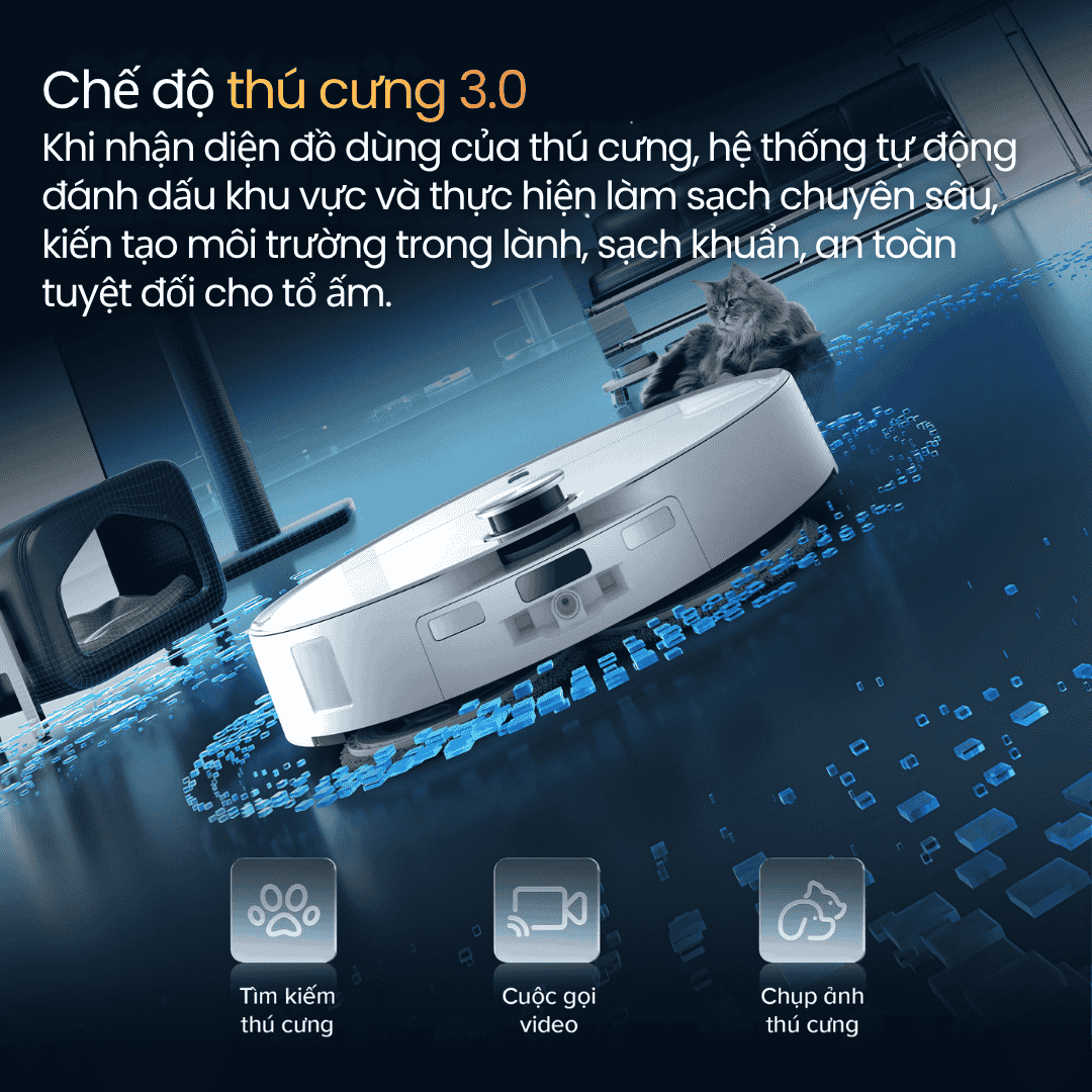Robot có khả năng nhận diện khu vực thú cưng, tự động làm sạch chuyên sâu, đồng thời cho phép xem video thời gian thực và trò chuyện 2 chiều. Bạn có thể giám sát và tương tác với thú cưng ngay trên ứng dụng Roborock.