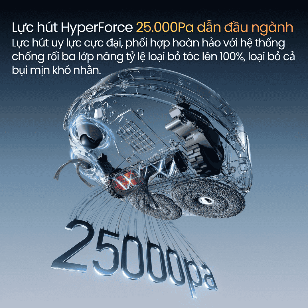 Trang bị động cơ HyperForce thế hệ mới, Qrevo Curv 2 Pro đạt đến lực hút cực đại 25.000Pa đứng đầu trong thế giới robot hút bụi, loại bỏ hoàn toàn bụi mịn, tóc và mảnh vụn chỉ trong một lần lướt. Hệ thống chống rối 3 lớp thông minh kết hợp chổi chính DuoDivide, chổi cạnh chống rối và bánh xe đa hướng, đảm bảo vận hành trơn tru, không vướng tóc và duy trì hiệu suất ổn định lâu dài.