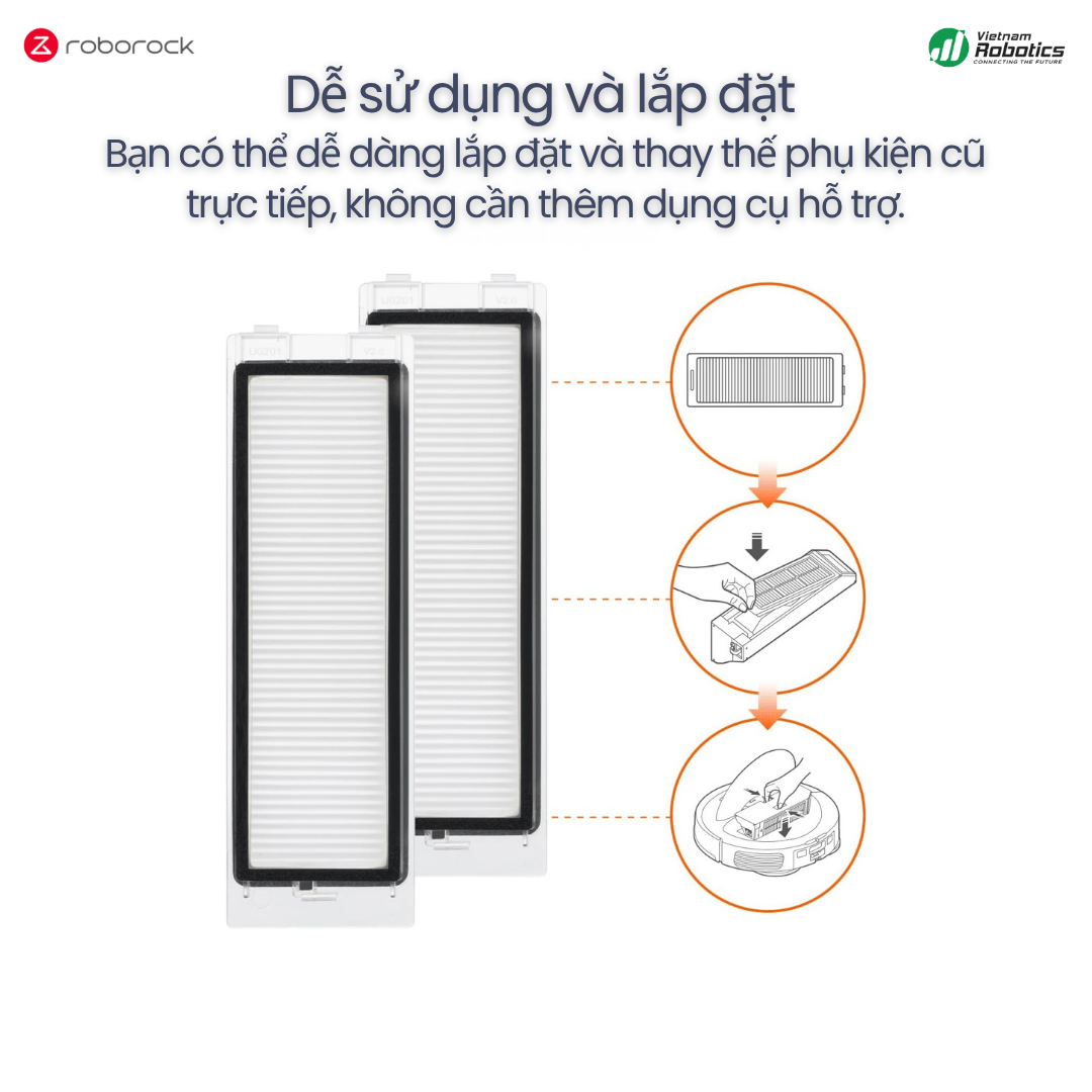 Tấm lọc HEPA này có thiết kế thao tác nhanh, gắn trực tiếp vào khay chứa bụi, giúp bạn thay thế mà không cần dụng cụ hỗ trợ. Việc lắp đặt trở nên nhanh chóng và tiện lợi, giúp robot luôn hoạt động ổn định với hiệu suất cao.