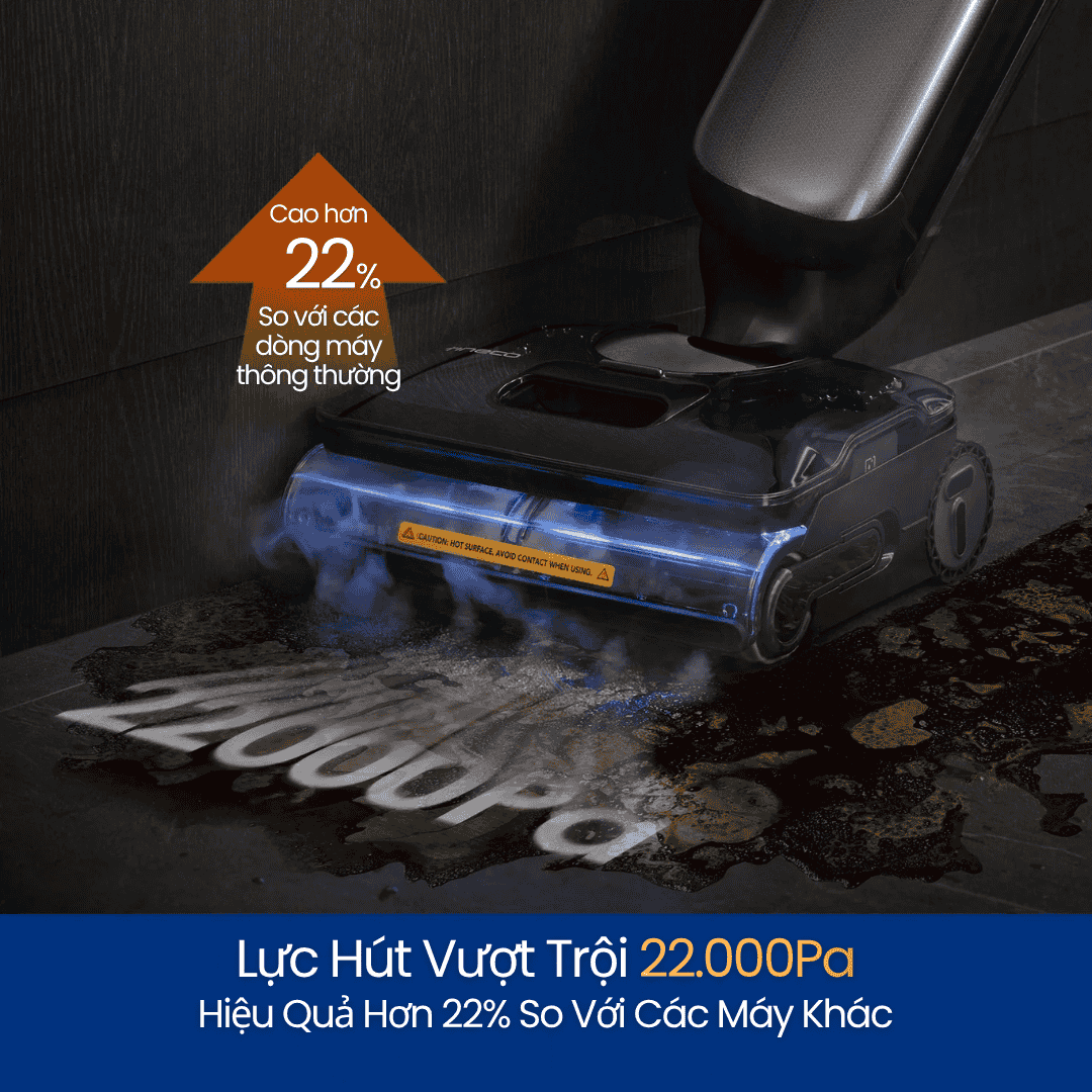 Thiết kế tinh tế: Kết hợp HyperSteam, FlashDry, lực hút mạnh 22kPa và lay-flat 180°, tạo nên máy hút bụi lau nhà không dây đa năng, đứng đầu phân khúc máy hút bụi hiện đại.