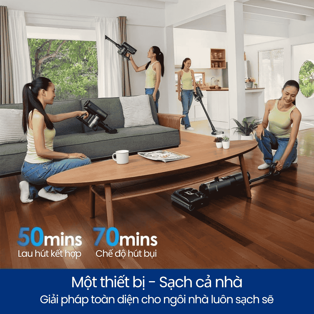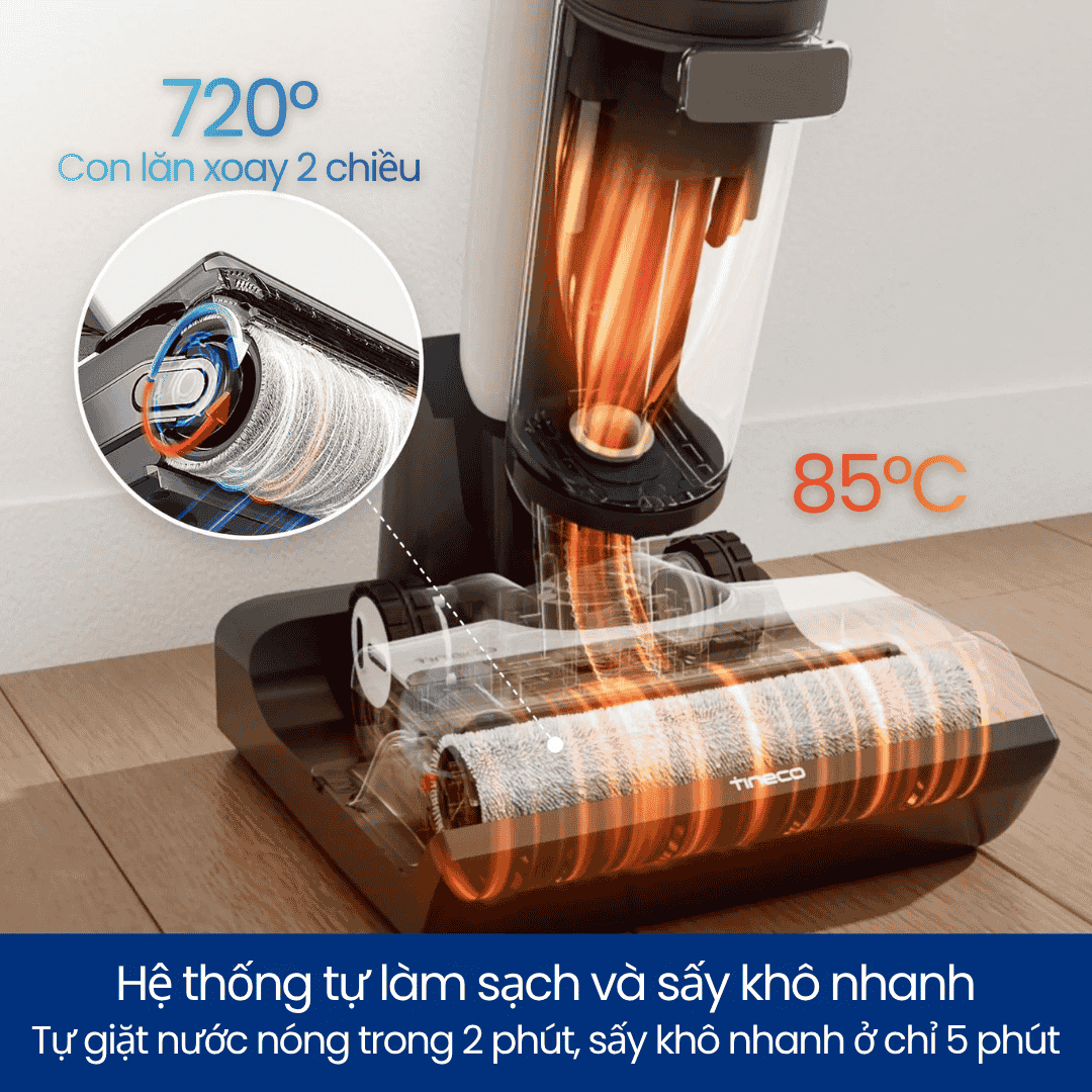 Đặc biệt, hệ thống FlashDry 85°C tự động giặt và sấy khô con lăn trong 5 phút, loại bỏ hoàn toàn vi khuẩn và mùi hôi, giữ cho máy luôn sạch sẽ và bền bỉ. Nhờ pin dung lượng lớn, Tineco S7 Stretch có thể hoạt động liên tục từ 50–70 phút, đáp ứng trọn vẹn nhu cầu làm sạch toàn bộ ngôi nhà chỉ trong một lần sạc.