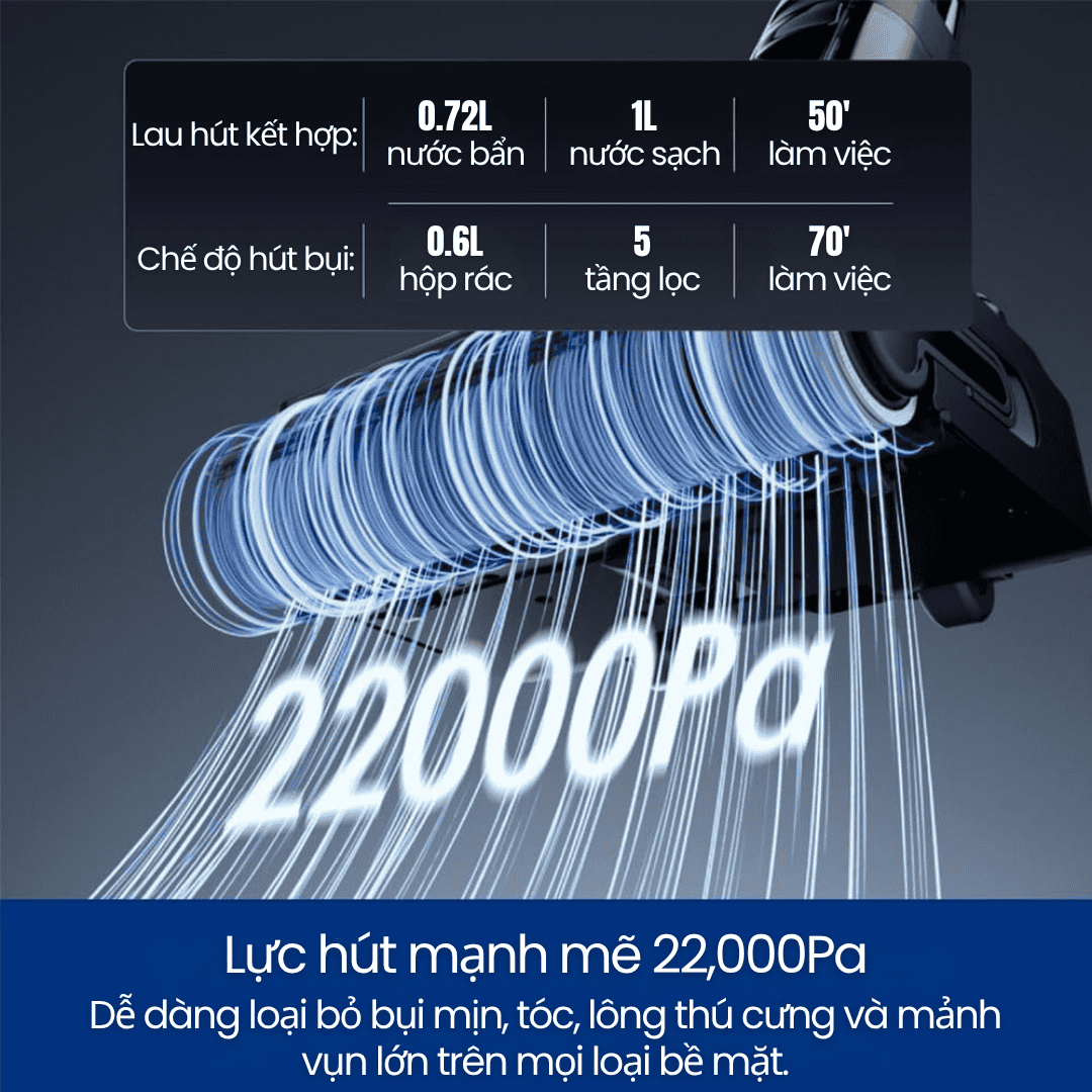 Lực hút 22.000Pa - làm sạch mạnh mẽ mọi loại bụi bẩn