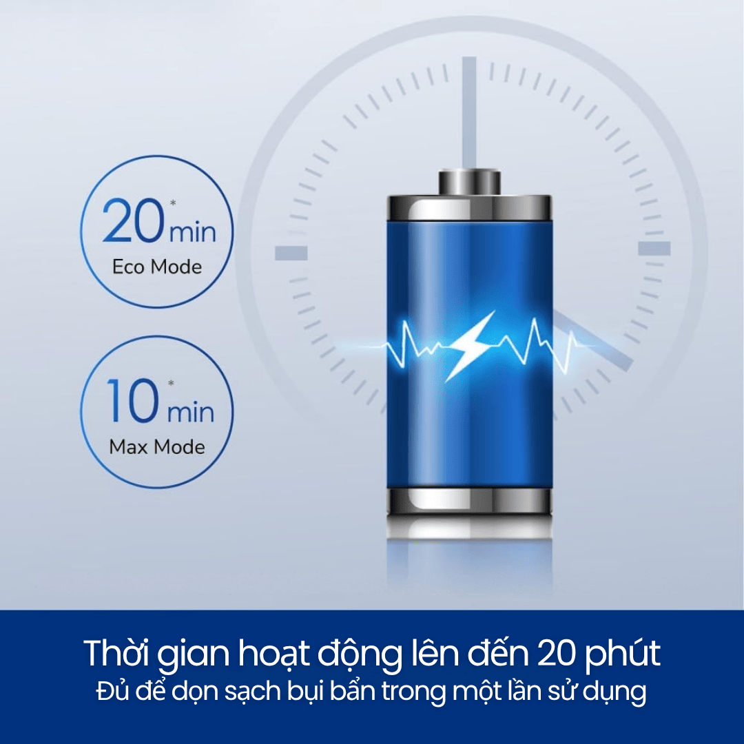 Thời lượng pin lên đến 20 phút: Đủ cho nhiều lần làm sạch nhanh trong ngày.